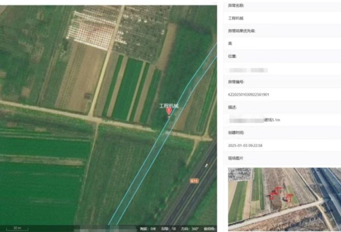 当前,大疆机场 2 已成功识别并处置多起异常情况。例如,今年 1 月 3 日,无人机在日仪线某桩附近发现 3 台挖掘机在管道正上方施工,系统立即告警。经核查为退林还耕作业,对管道无影响,有效避免了潜在破坏事件。