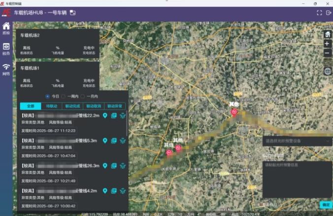 在核查场景下,系统接收其他系统告警后,将迅速调度巡护车辆前往距离告警点*近的起飞点,并远程启动无人机开展空中核查。当前,单套车载移动机场系统可覆盖 50 公里管线应急需求,将响应时间缩短至 15-30 分钟,实现“随发现随处置”,大幅提升应急处置效率。