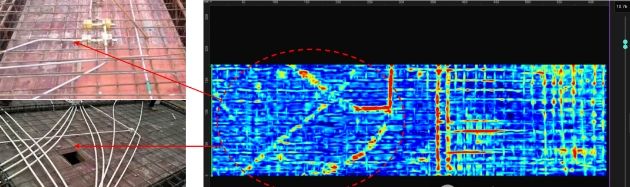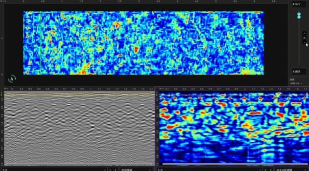 为进一步验证准确性,将检测结果与施工现场预埋管线真实照片比对,二者分布形态高度相似;同时依据《12SG121-1-施工图结构设计总说明》第 9.6.8 条 “板内预埋管线应布置于板底与板顶钢筋之间” 的规定,*终确认该信号为预埋管线信号。