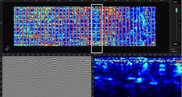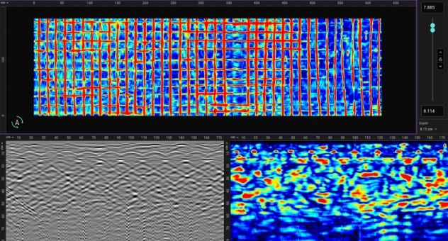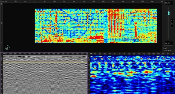钢筋检测:通过 GP8100 雷达深度切片与 B 扫图像分析,清晰识别出楼板内部双层钢筋的分布情况。其中,首层钢筋位于 8 cm深度左右,其信号在深度切片中连续且规整,对应的 B 扫图像在同一深度处呈现特征鲜明的双曲线雷达信号;
