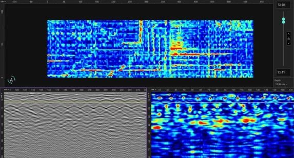 管线检测:雷达深度切片在约 11 cm深度处显示数道连续条状信号,经对应 B 扫图判断,该深度存在清晰的双曲线信号(管线典型特征),且确定管线位于一、二层钢筋之间。