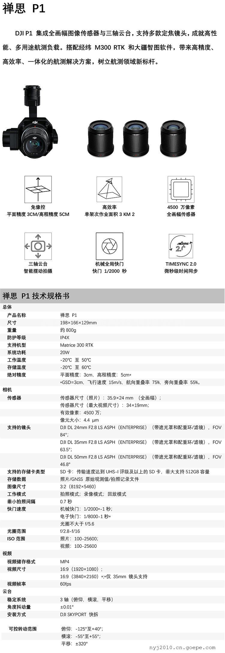 详细信息| 询价留言品牌:大疆 型号:禅思P1 加工定制:否 外形尺寸:198×166×129mm mm 用途:建筑工程地形测量测绘勘察 加工定制:否 -