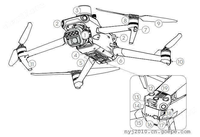 16.智能飞行电池17.电池开关 18.电池卡扣 19.多光谱光强传感器