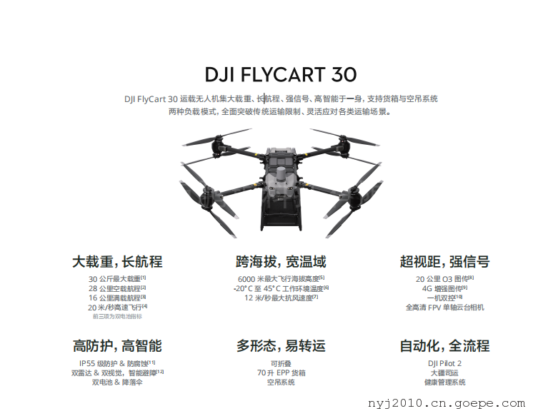 大疆应急救援物资运输无人机载重30KG,适用于山地、岸基、乡村运输场景及各类应急场景下的物资运输。 FC30 采用 4 轴 8 桨多旋翼构型,双电模式下载重 30 公斤、满载航程 16 公里。