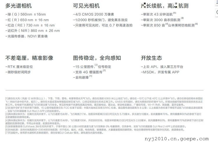 高度集成影像系统升级的的影像系统,集成了 1 个 2000 万像素可见光相机及 4 个 500 万像素的多光谱相机(绿光,红光,红边和近红外)。可实现高精度航测、作物生长监测、自然资源调查等应用。光强传感器机身集成多光谱光强传感器可采集太阳辐照度并记录于影像文件中,可在二维重建过程对影像数据进行光照补偿,获得更准确的 NDVI 结果,提高不同时段采集到的数据的准确度与一致性。RTK模块不差毫厘,精准影像Mavic 3M 搭配 RTK 模块,实现厘米级高精度定位。飞控、相机与 RTK 模块微秒级同步,精QUE获取每个相机成像中心的位置信息,使 Mavic 3M 在高速飞行下也能做到免像控航测。信号稳定,图传流畅O3 图传集成 2 路发射信号和 4 路接收信号,支持 15 公里超远传输距离。可选配 DJI Cellular 模块,4G 增强图传与 O3 图传行业版可同时工作,即使在有山体、建筑遮挡的环境下,也能确保信号稳定,飞行更安全。全向感知,仿地航测机身配备多个广视角视觉传感器,精QUE探测各个方向上的障碍物,实现全向避障。面对大坡度山地场景,结合机身下视觉传感器可直接实现仿地航测,带来单架次 850 亩的山林果树航测效率。