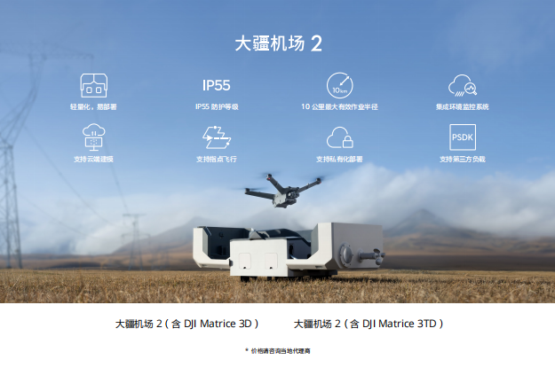 详细信息| 询价留言品牌:DJI大疆 型号:机场2 加工定制:否 外形尺寸:舱盖开启:长 1228 毫米,宽 583 mm 重量:34 千克(不包含飞行器) ㎏ 加工定制:否 -